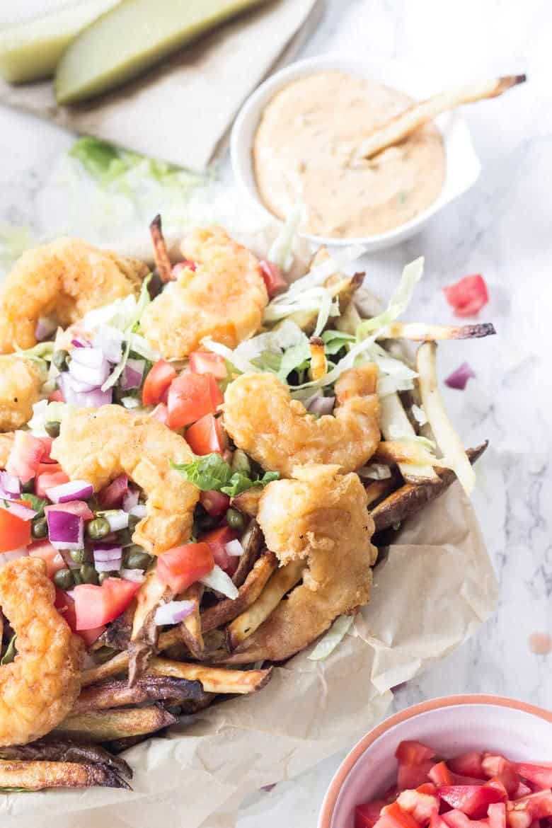 And what happens when you top said fries with the classic shrimp po’boy toppings?? Well, you end up with one glorious meal that’s what. Let me just clarify that no, this recipe is in no way healthy but it is HEALTHIER than grabbing a vegetable oil laden po’boy sandwich from your local diner in town. Yes, much healthier. So we’re going with it. Join me?