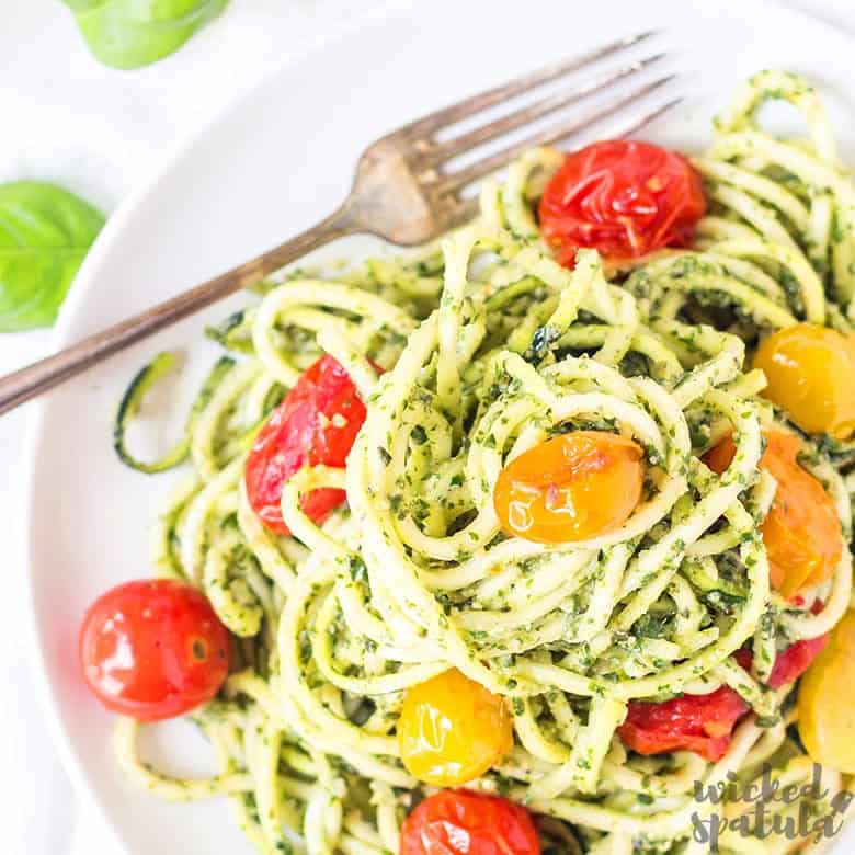 - Mix zucchini noodles with pesto. Toss in the blistered tomatoes and serve.